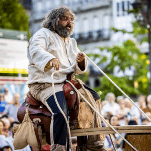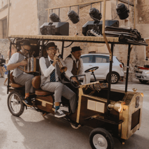 Un espectáculo de calle que combina música en directo, circo y humor visual, transformando el espacio urbano en un lugar de encuentro y celebración compartida con el público.